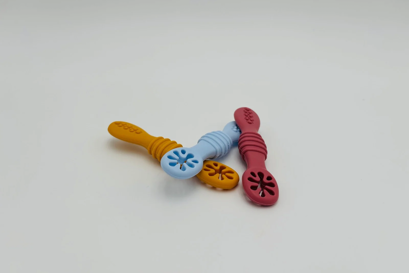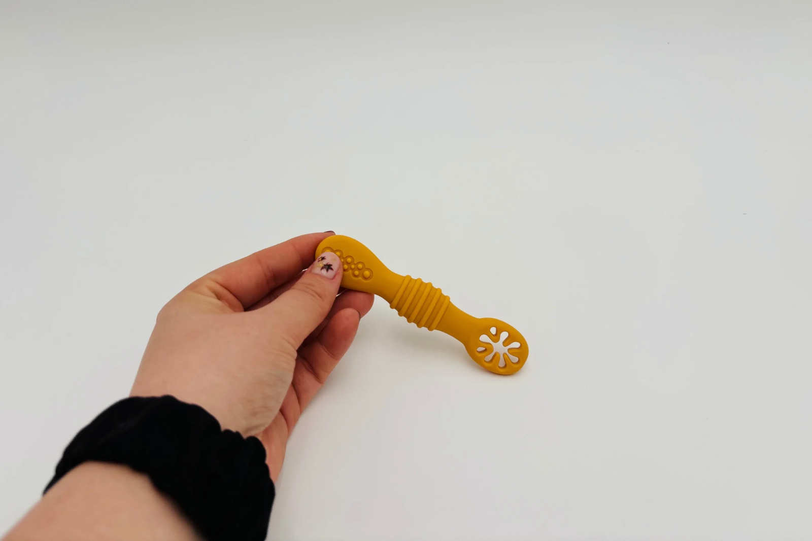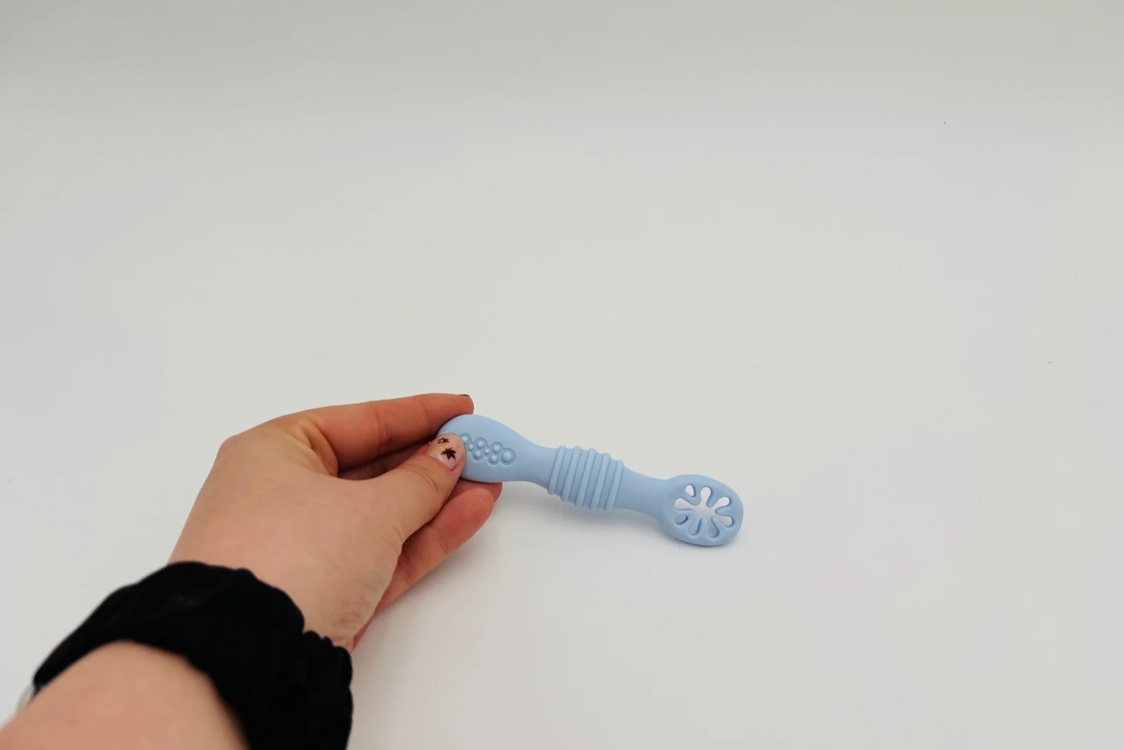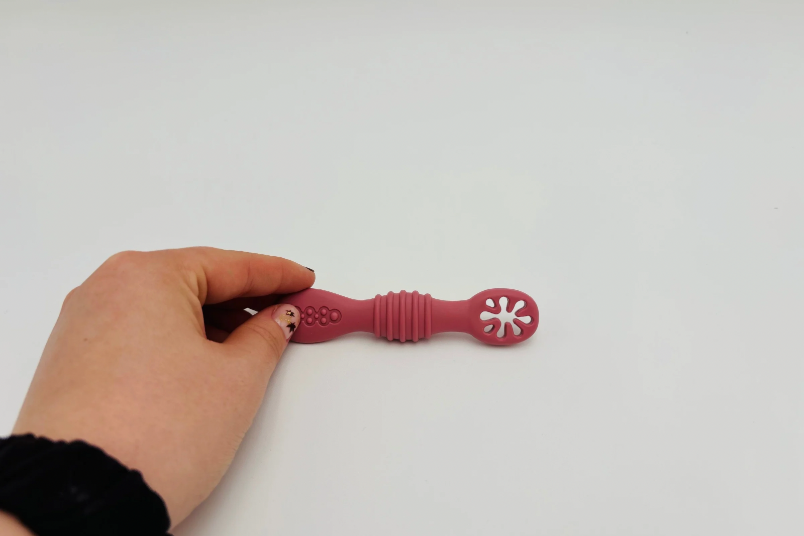 Grâce à sa forme ergonomique, les aliments semi solides restent dessus. Utile également comme hochet de dentition ou de mastication.