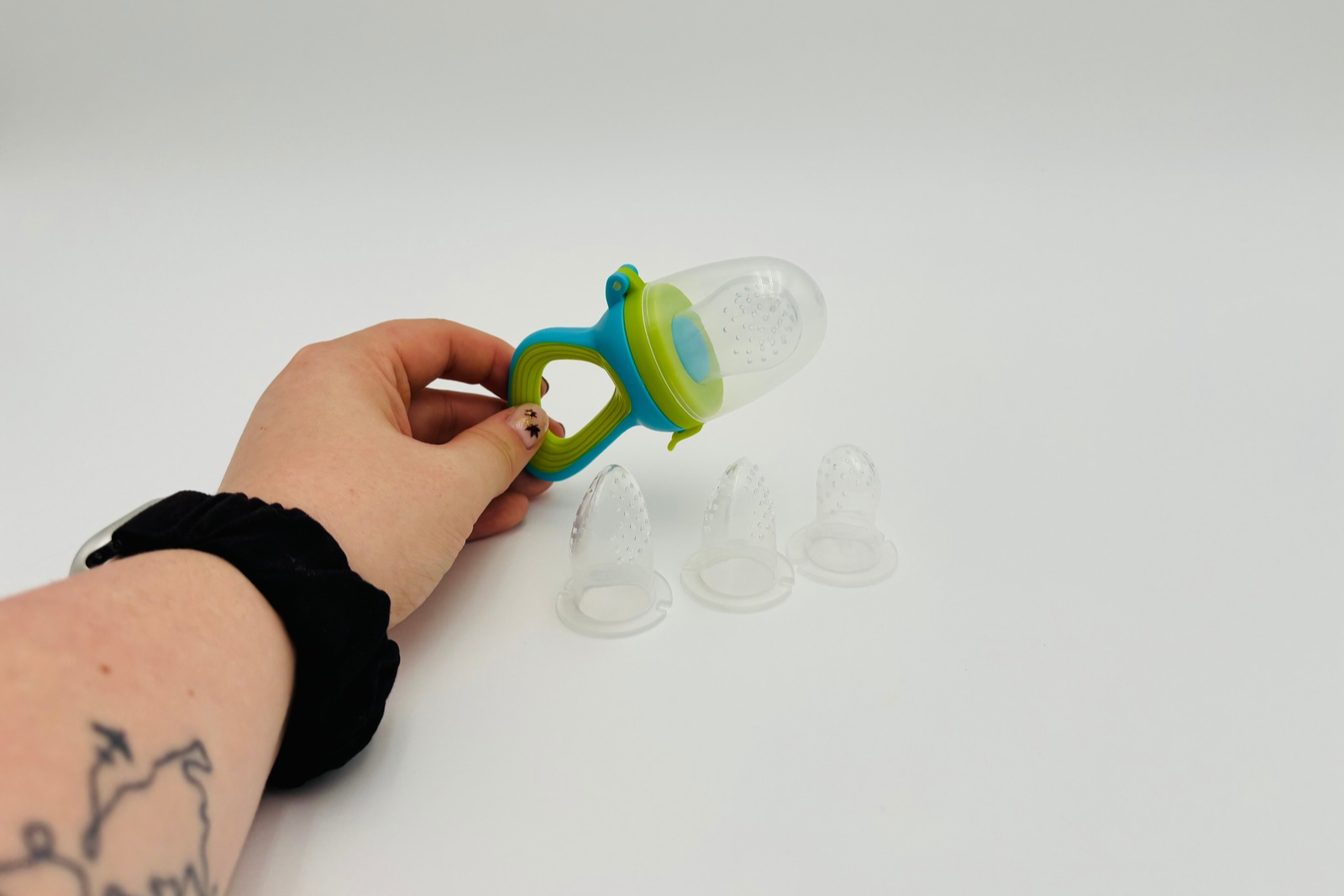 Grignoteur alimentaire permettant la découverte des aliments en toute sécurité (fruits, biscuits...).