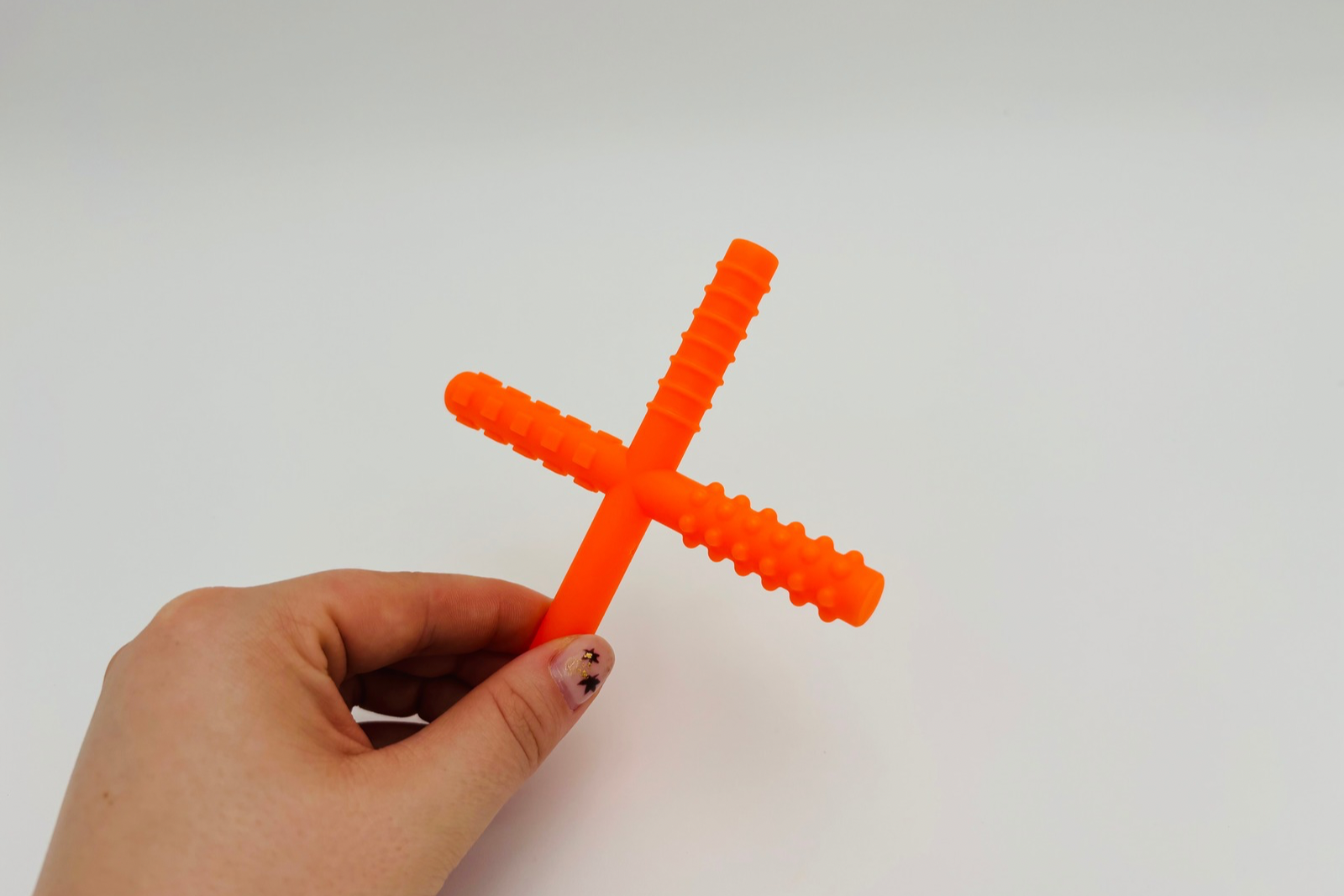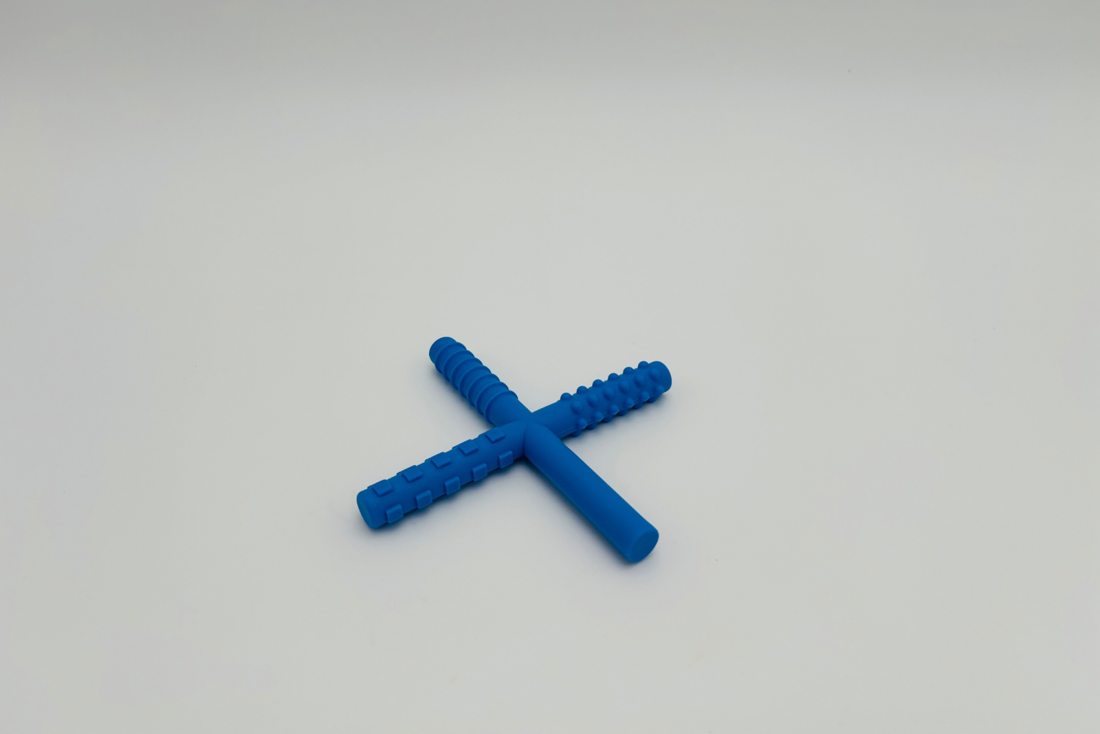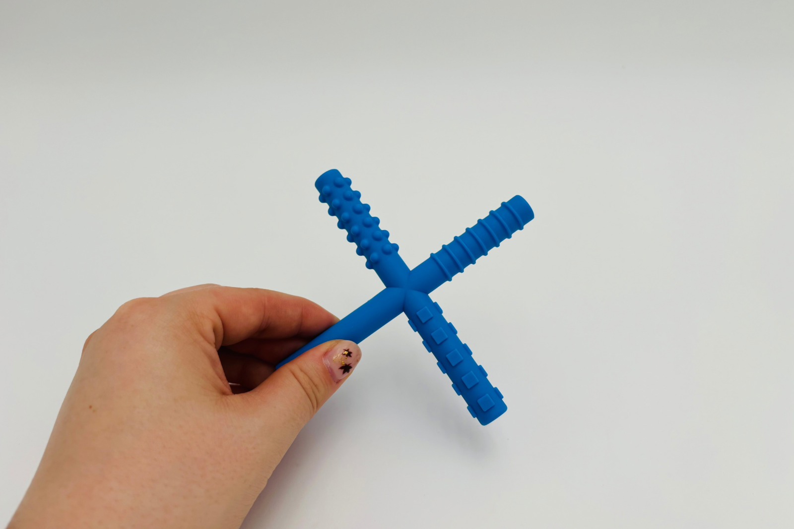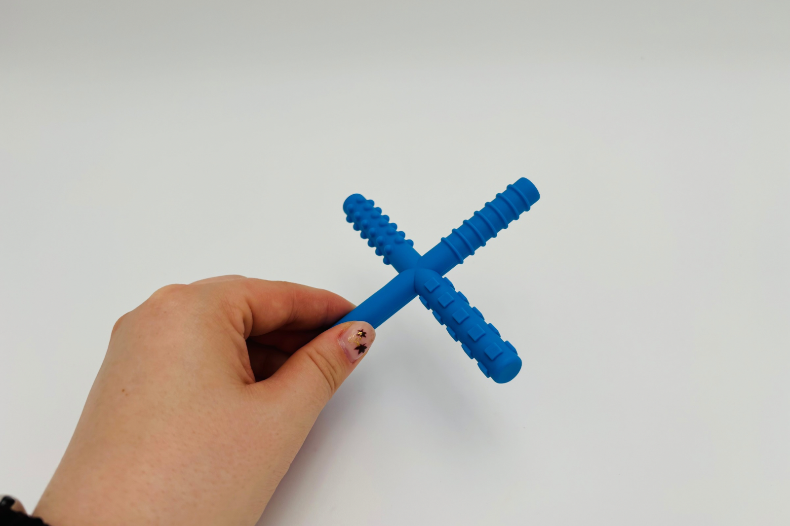 Outil de mastication avec 4 tiges de textures différentes : lisse, nervures circulaires, lignes et carrés.