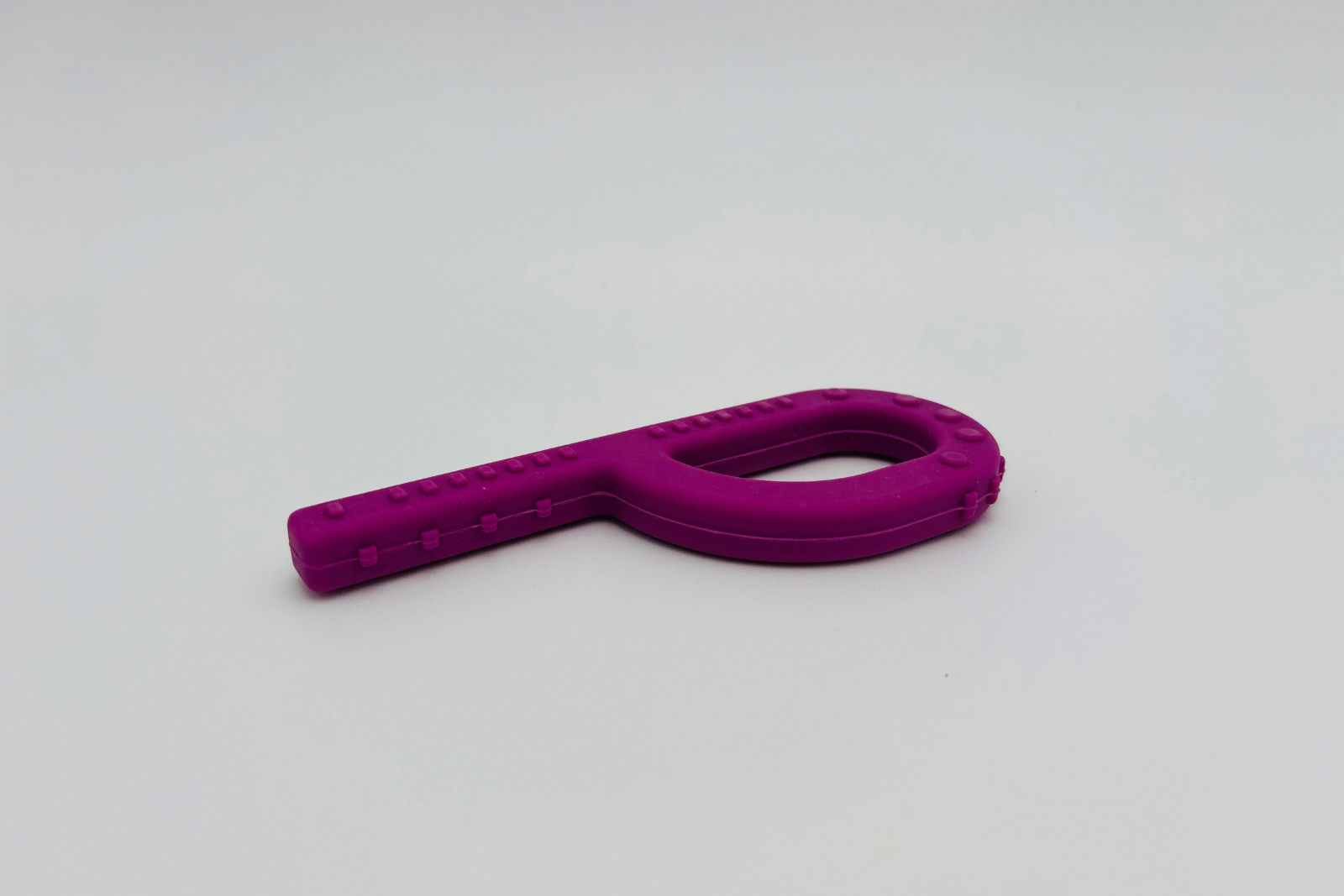En forme d'anneau, il est pratique à saisir. Sa longue tige permet une mastication efficace. Contrairement aux tubes de travail oro myo fonctionnel, cet anneau est de forme pleine. Sa version texturée permet une proprioception différente.