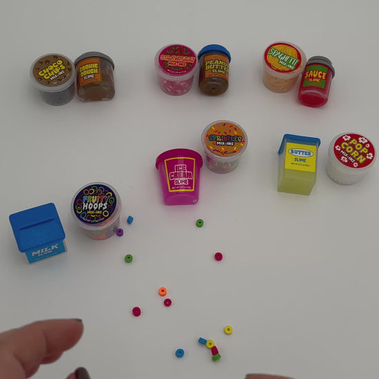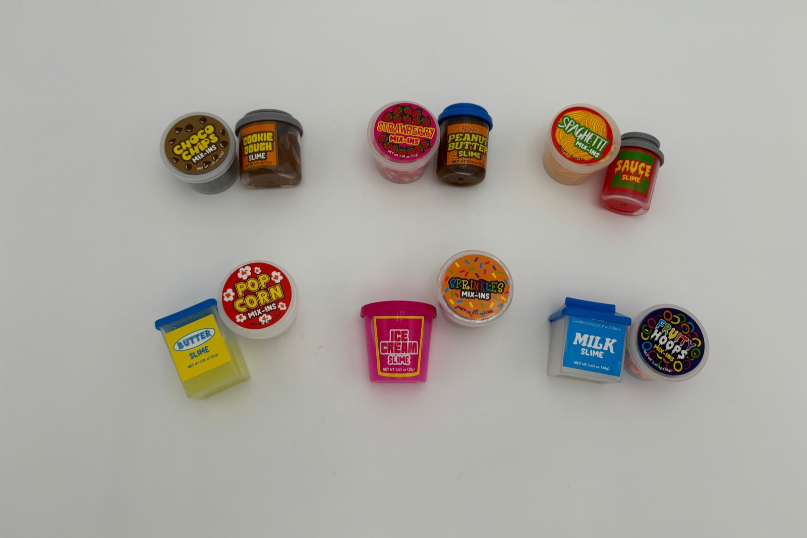 Mélangez et créez des combinaisons amusantes : slime blanc laiteux avec des céréales croquantes, ou slime rouge tomate avec des spaghettis rigolo par exemple.