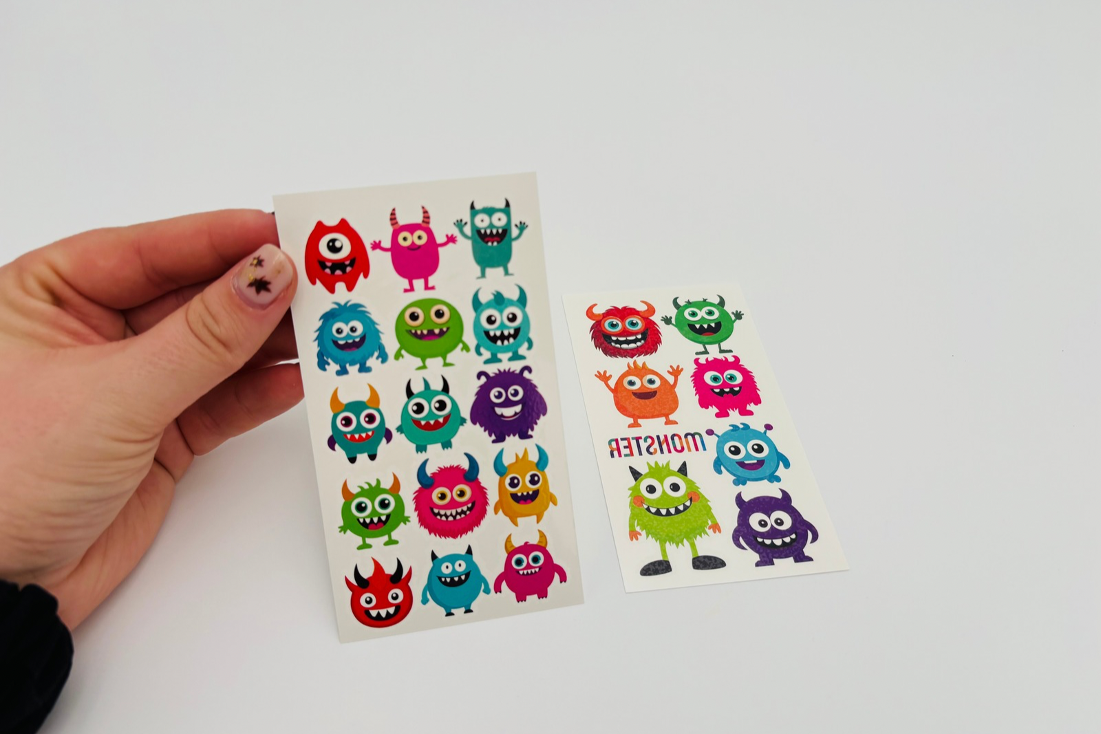 Lot de deux feuilles de tatouages monstres à découper puis coller sur la peau avec de l'eau. À utiliser comme récompenses ou renforçateurs durant vos séances par exemple.